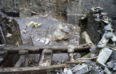 Here we are under the "10,000 ton boulder" just above G floor, looking up towards the drumhouse high above. The HIK incline bed itself is buried with rubbish.