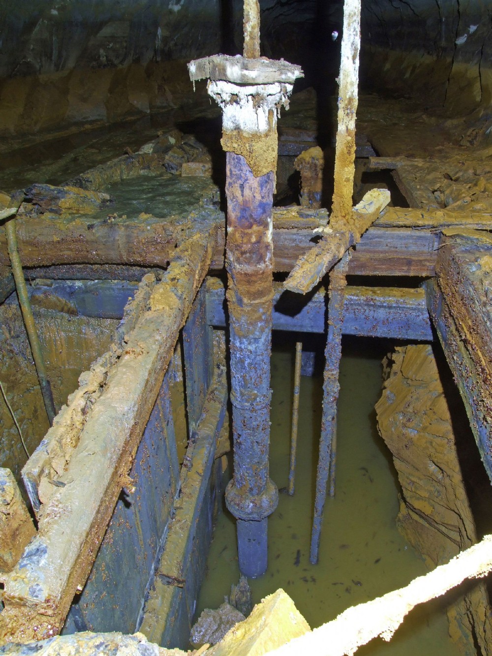 This picture shows the two compartments of the underground engine shaft. Left was for raising ore, right pumping and manway.