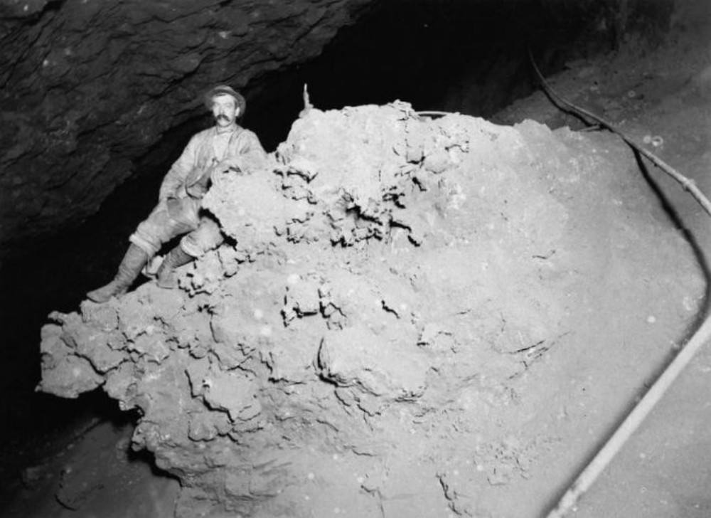 UNDERGROUND VIEW OF MINER PERCHED ON MASS COPPER. NOTE THE CANDLE AND COMPRESSED-AIR LINE. C. 1890. - Quincy Mining Company, Hancock, Houghton County, MI