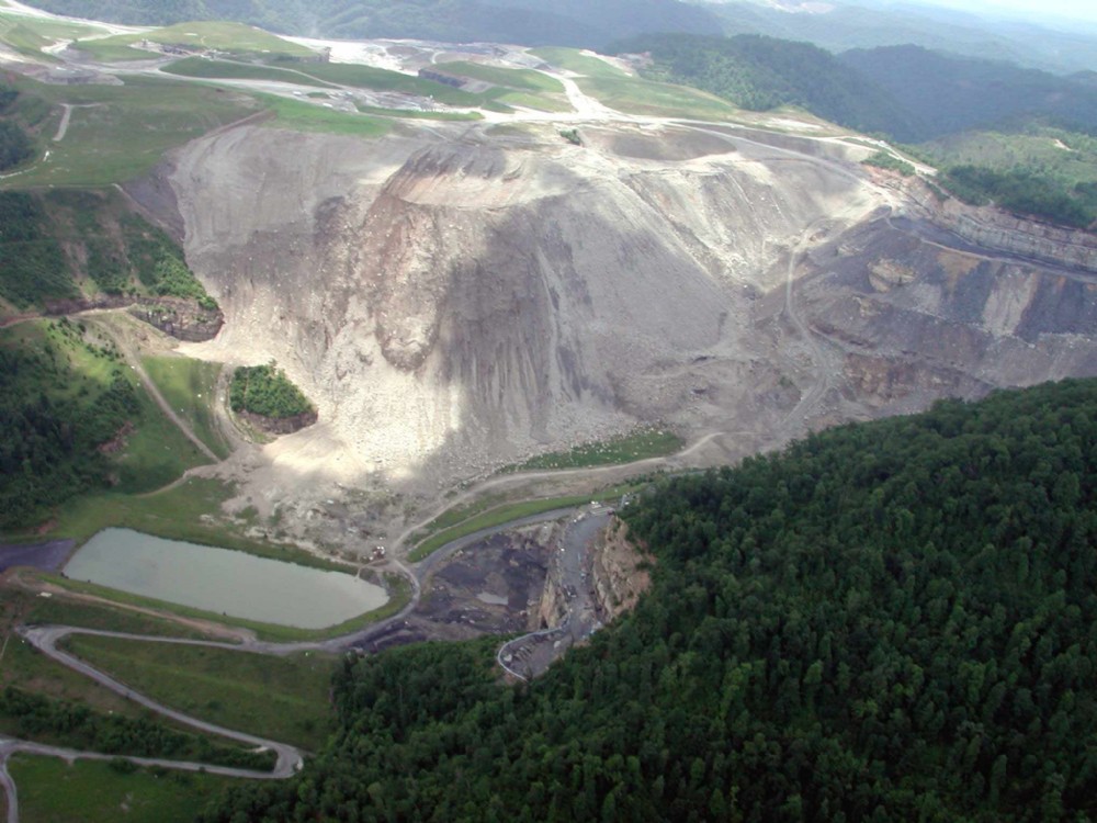 Independence Coal (a Massey Energy subsidiary) operates the Upper Big Branch surface mine, where this massive valley fill looms over the devastated landscape The valley fill is locally known as the Birchton Curve Valley Fill.