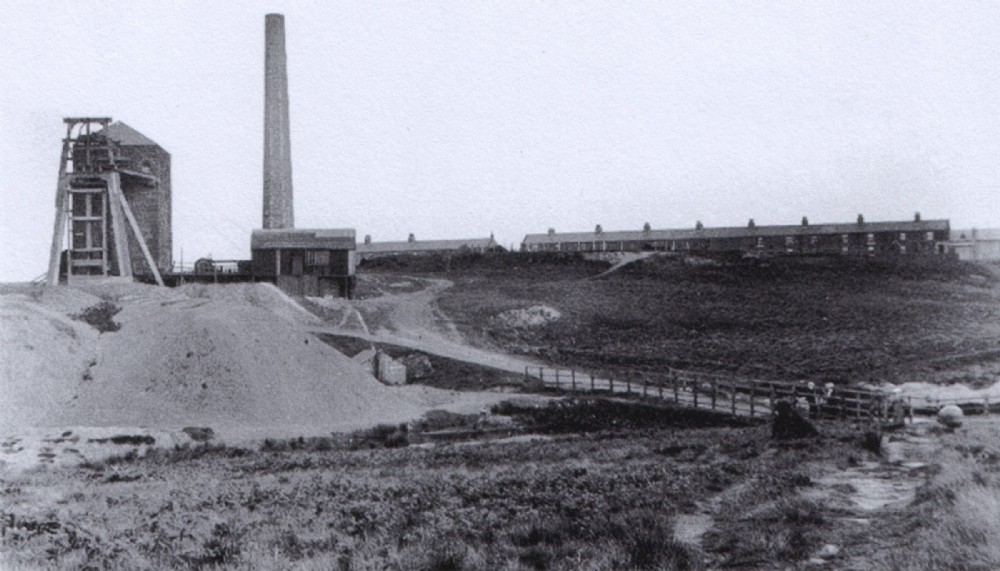 The photo pre-dates the electrification of the site which occured sometime around 1912, the large building on the left is the original stone winding house but by this point it is no longer in use and has been replaced by a smaller winding house which is the hut infront of the chimney. The original wooden headgear is still in use but it has been modified to except the new position of the winding ropes.