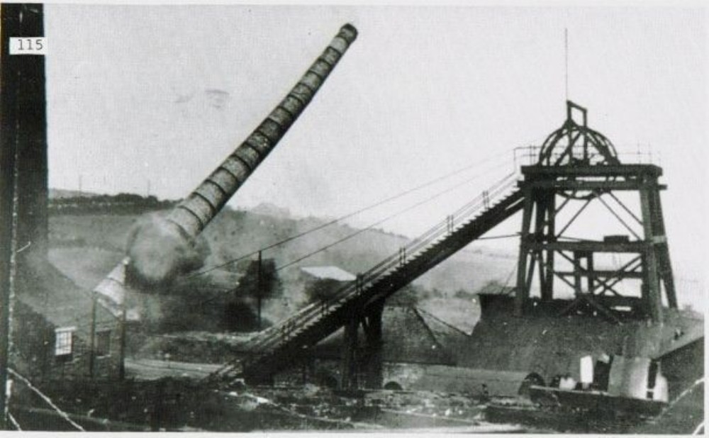 Taken in 1932 during a revamp of the colliery -demolition of a chimney at Ushaw Moor Colliery-the building behind the stay legs on the headstocks is now the only remaining building onsite ,now used as a substation .