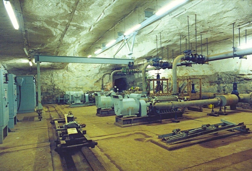The two pumps in the foreground are SPP multi-stage pumps, pumping up to the sump on 9 level that gravity feeds the 10 level pumps. Which in turn pump fresh water to surface for the mill.