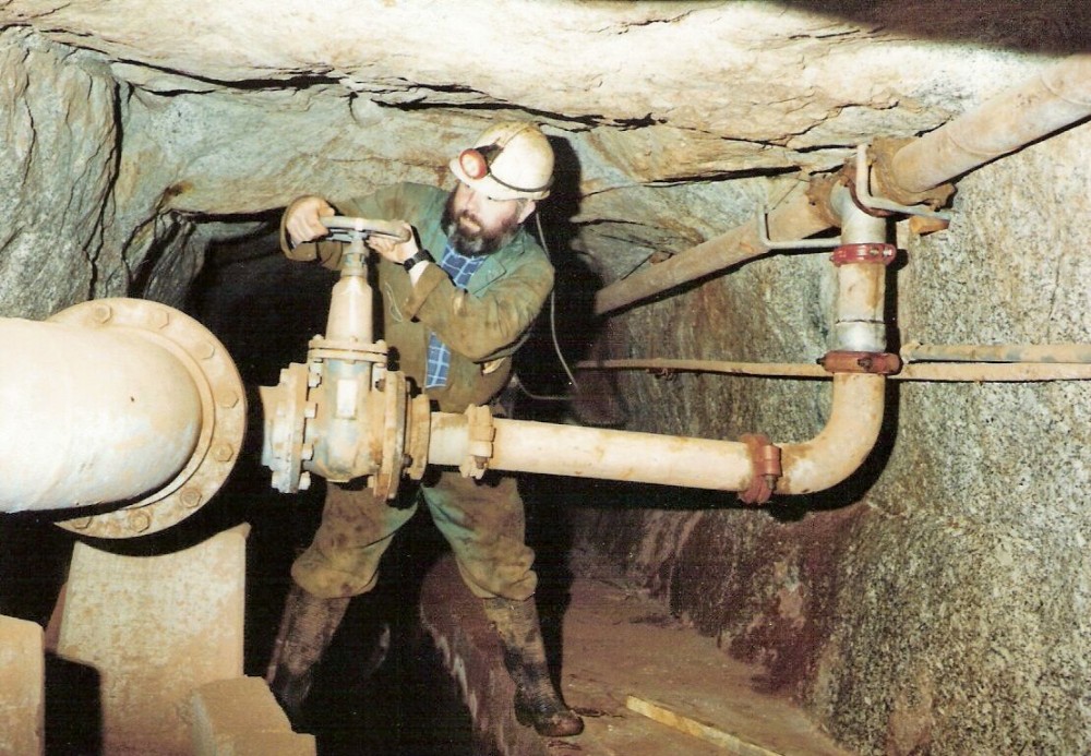 Bob Orchard opening valve to drain pig lode sump water to bottom of incline via the disused compressed air pipes (So that the water would not be seen while underground tours were still taking place).