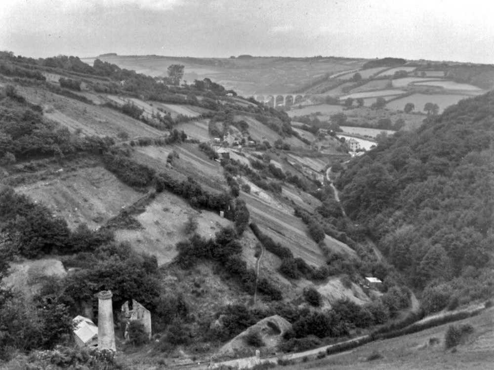 Description: Viewpoint, near Trehill. Looking SE. Tamar Valley. The river is seen in the centre of the picture which shows a very steep-sided tributary valley, now dry. The slopes, with southern aspect are used for intensive market gardening. The mine buildings, in the foreground, are of Cotehele Consols. The viaduct crosses the Tamar at Calstock village and carries the branch line to Callington (Kelly Bray) Station.