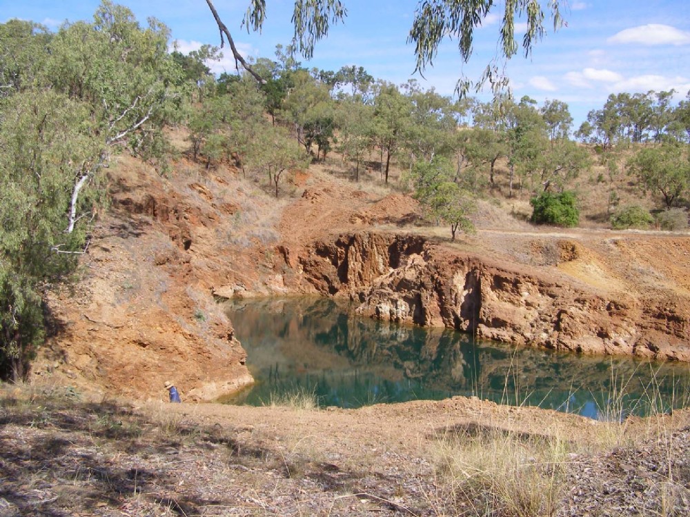 Looking south and southeast across the main open pit. An old shaft is visible beyond the far edge of the open cut.