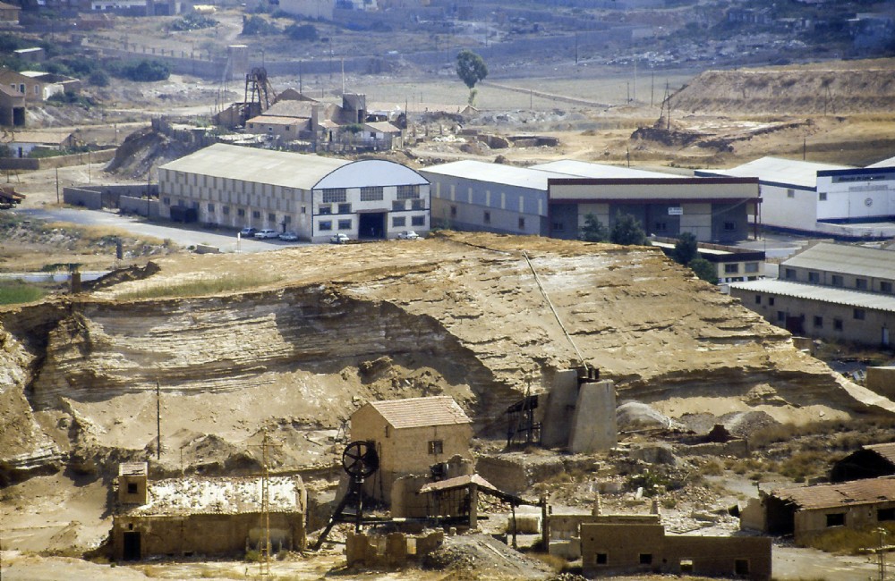 These mines lie a little to the west of La Union, which, itself is a mass of mining remains in the outskirts. Here, a view looks towards some modern warehousing, whilst a large dried tailings dump takes up the mid ground. Smaller workings, denoted by the sheave wheels are dotted about.