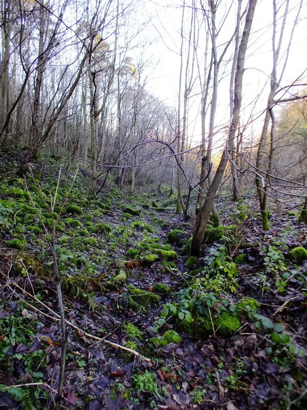 Looking downstream from the sough mouth along the line of the bolt. The flour mill pond is on the right, the sough is to the left