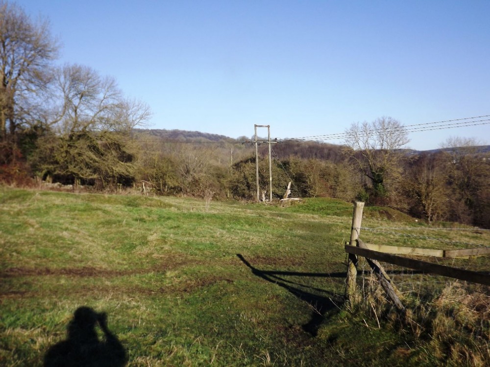 View looking north across the site. The fence is for the pond, in front and to the left of the earthworks and channel likely to be part of ore processing to the right next to the telegraph pole is the main shaft mound and platform. (December 2012)