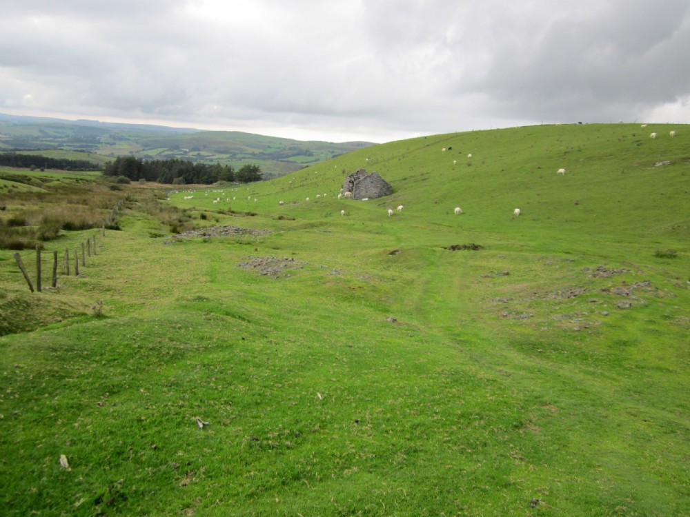 Looking to the west from the ore bin - various spoil heaps and depressions. The stone structure is a derelict domestic building probably unconnected with the mine.