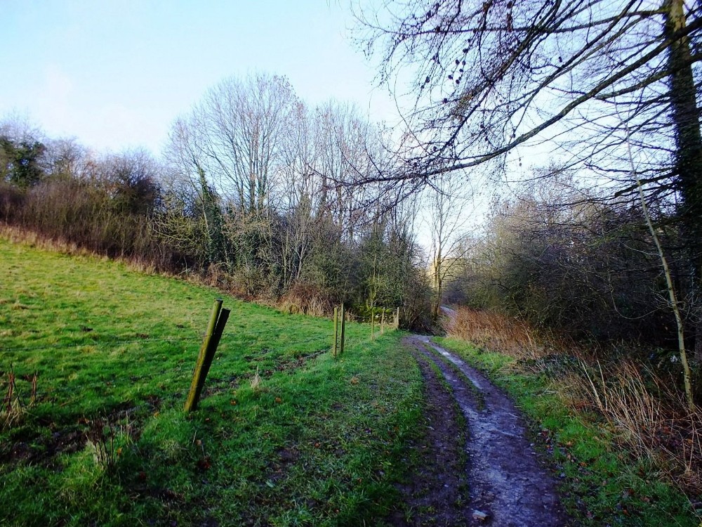 View looking northwest along the path, the shaft is located in the woods on the left