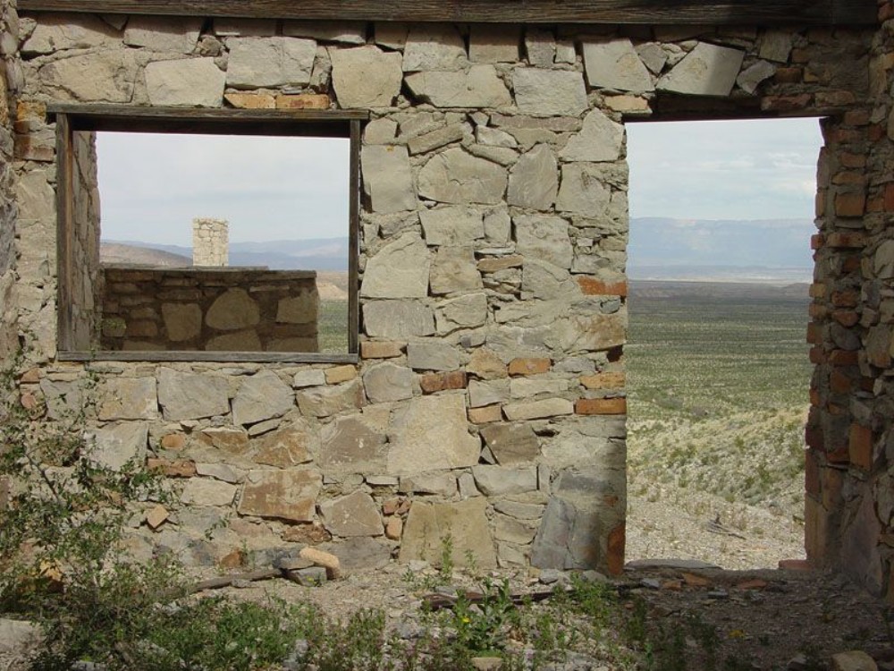 View looking east from one of the building ruins of the Mariscal Mine. The Sierra Del Carmen is in the distance.