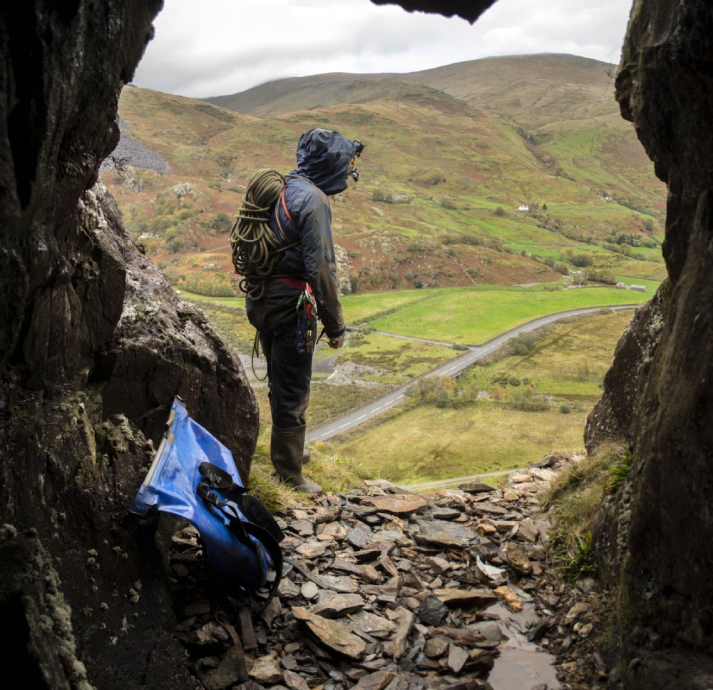 Looking out from the top adit. This enters some stoping as a crosscut to the lode (roughly parallel with the valley). Higher workings above this level outcrop in the mountain side, and appear to have been trialled in the 20th cent.