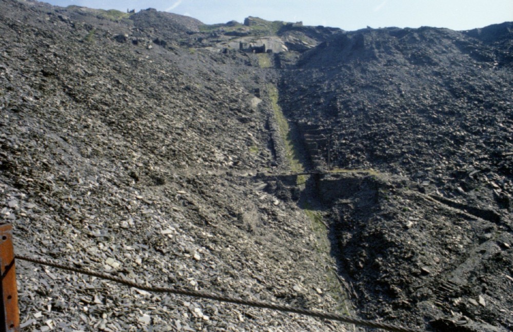 This is what the Tuxford Incline remains looked like in 1981 - the longitudinal timbers which carried the rails were still visible, as was the bridge at the old Diffwys Floor 0 - the original Tuxford tip level of around 1900. This was superceded by the higher Tuxford tip at Diffwys floor 3 level in 1911-12.