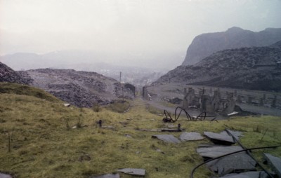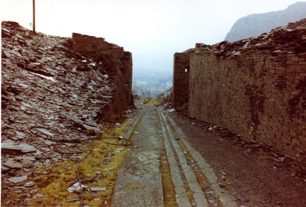 A closeup of the Votty C floor Waste overbridge over the Diffwys Incline at Easter 1975 looking down towards Lord Street and the FR terminus at Duffws.