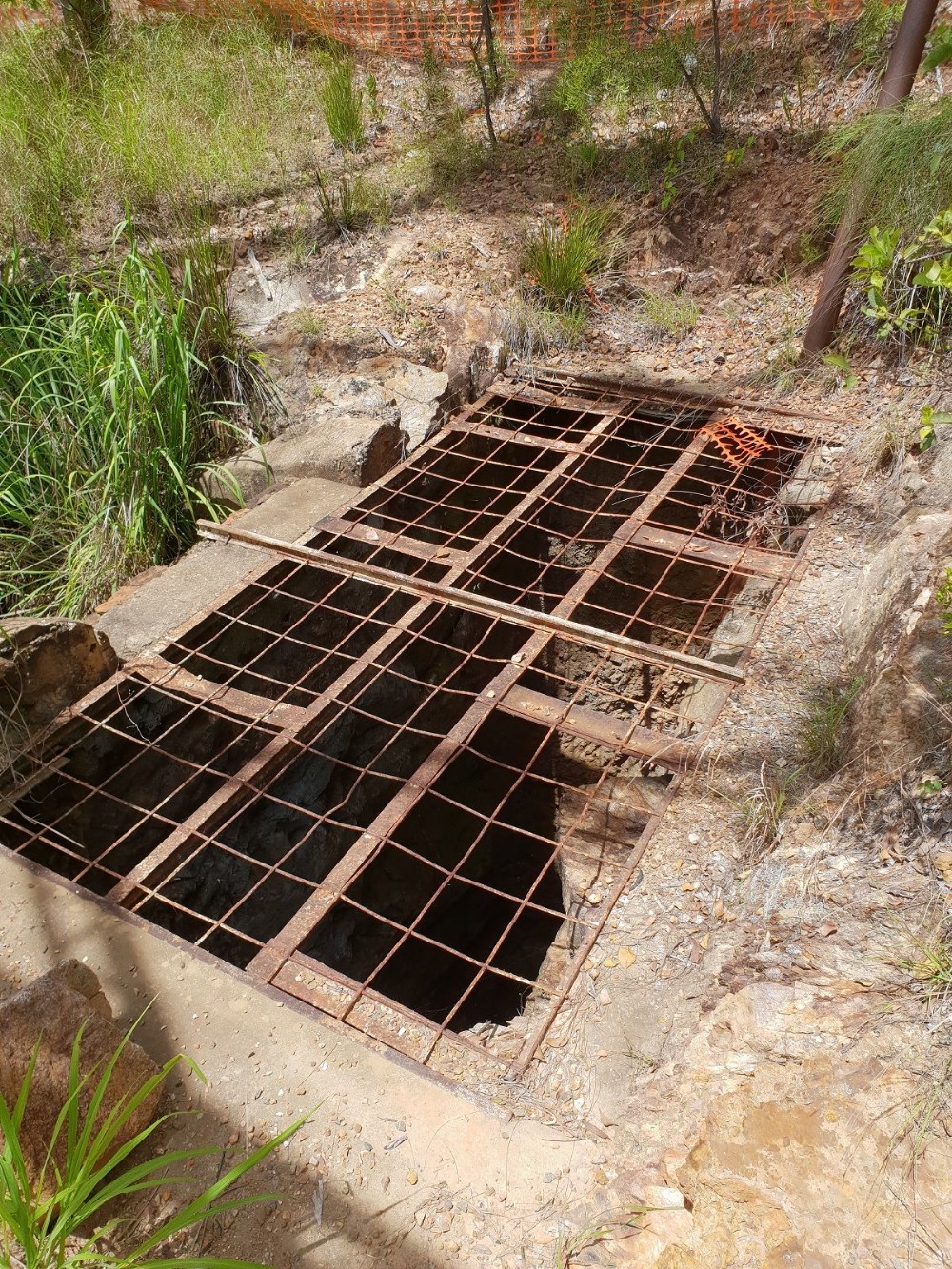 The mesh cover over the shaft. Rising main pipe adjacent to back right corner.