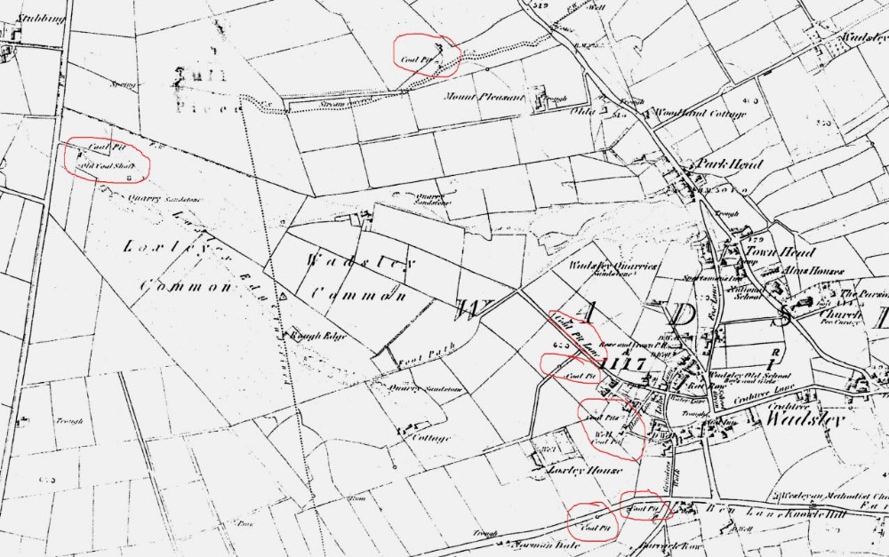 1850 Ordnance Survey map extract showing coal pits in the Wadsley area. Coal Pit Lane is also circled.
