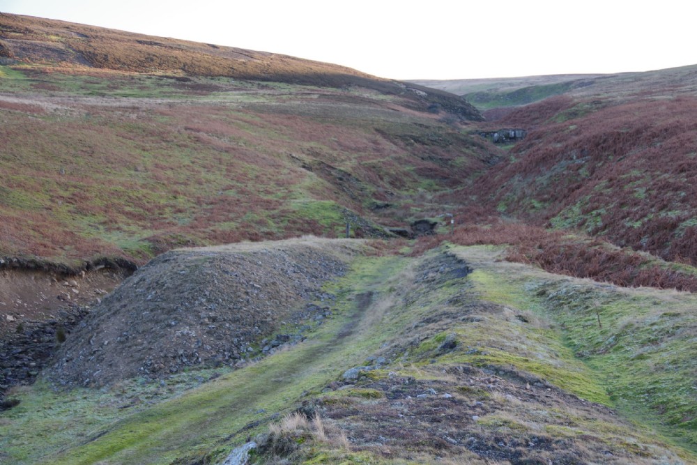View looking south. One adit entrance collapsed on east (LH) side of burn, another adit marked on west side of burn on OS map - not visible. Some concrete structures around adit entrances. To south east is a fenced air shaft which is open. this looks to have been driven as a rise from within the mine - no dump at surface.