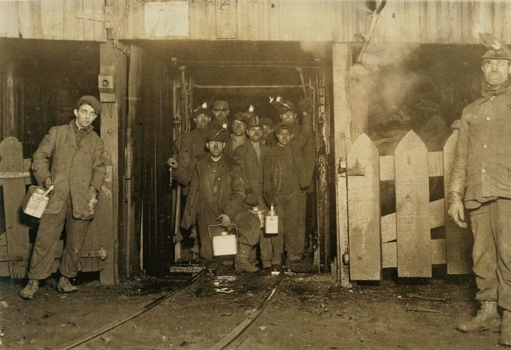 At the close of the day. Waiting for the cage to go up. The cage is entirely open on two sides and not very well protected on other two, and is usually crowded like this. Small boy in front is Jo Pume, a Nipper