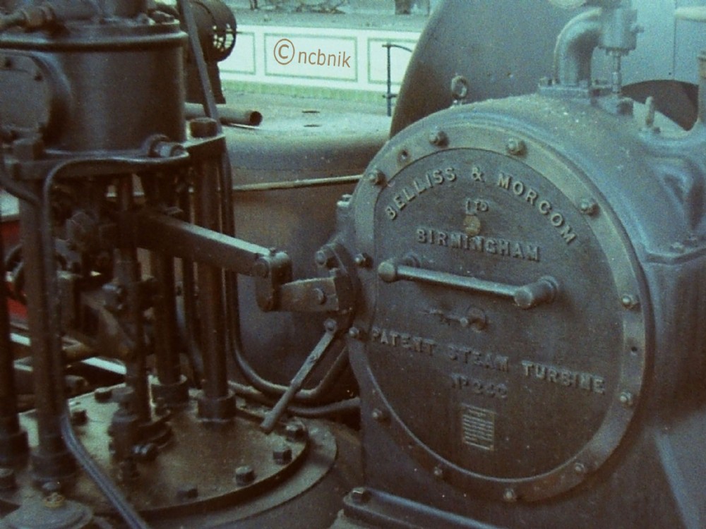 Walton power plant No.1 Turbo-Alternator - turbine end. The stop valve mech is the assembly to the left. If you look carefully at the top of the photo just to the left of the 'copyright' notice you can see a curved cage assembly which is the one clearly visible in Dickie Bird's adjacent photo which shows No.2 Turbo-Alternator; this cage is the exciter dynamo cover. The turbines of both sets were, in essence identical although installed around 17 years apart; the alternators attached were different however. No.1 was an English Electric 1875 kVA alternator, No.2 a Lancashire Dynamo & Crypto 2500 kVA. Both were 3,000 rpm 2pole/phase types
