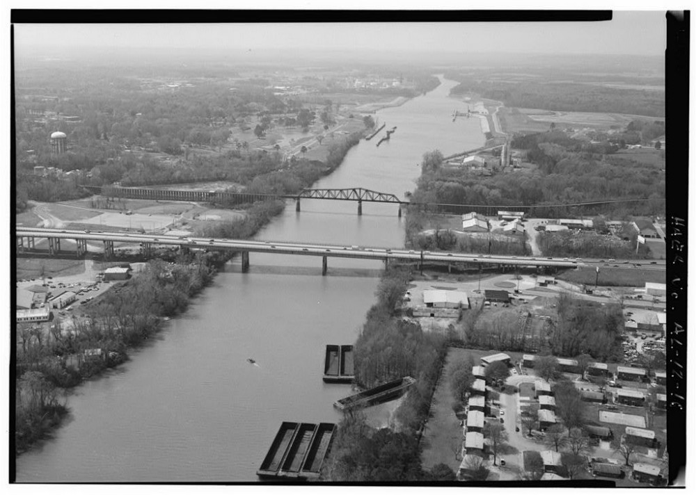 VIEW LOOKING NORTHEAST, WARRIOR RIVER, OLIVER LOCK IN RIGHT BACKGROUND, GULF MOBILE & OHIO BRIDGE IN MIDDLE GROUND, LURLEEN WALLACE BRIDGE IN FRONT OF GULF MOBILE & OHIO.