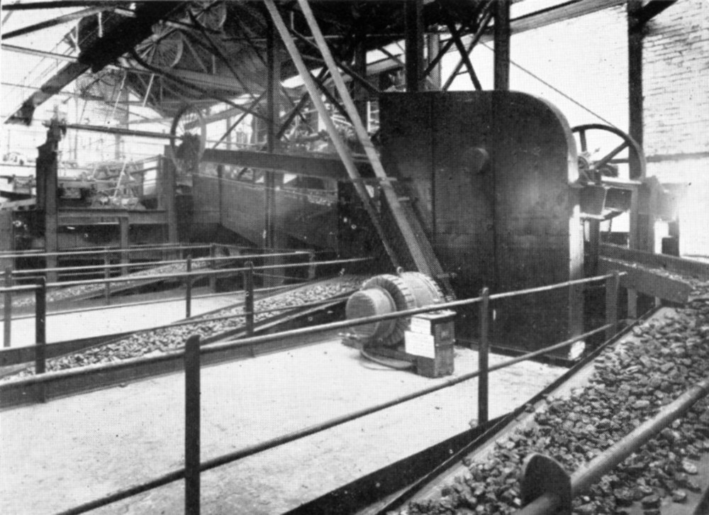 Caption: "In this picture the washed coal is shown separated into sizes. Most of the water has been extracted by the machines in the background, and the coal is passing onto loading belts leading to the railway wagons."