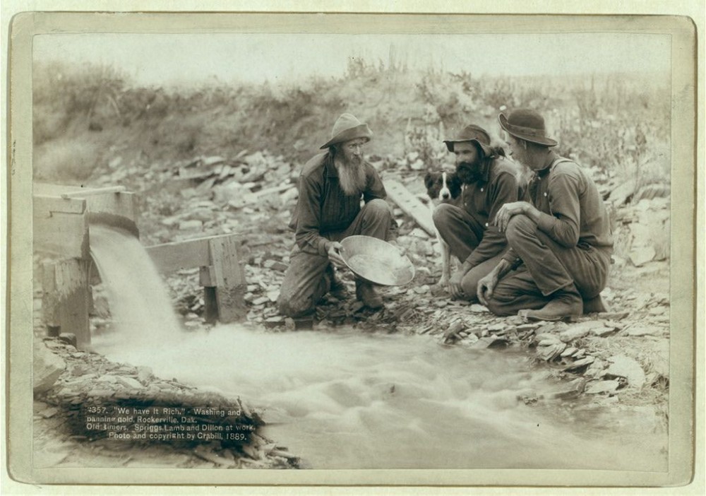 "We have it rich." Washing and panning gold, Rockerville, Dak. Old timers, Spriggs, Lamb and Dillon at work 1889.