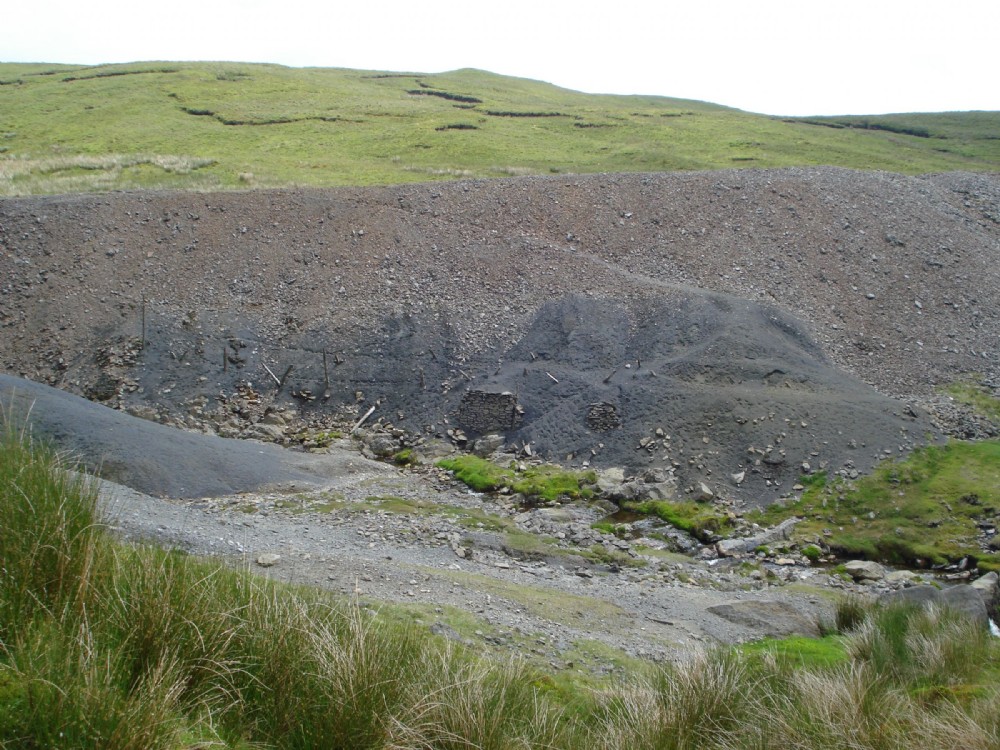 View from the west side of the valley of the extensive dumps of both mined waste rock and processing waste