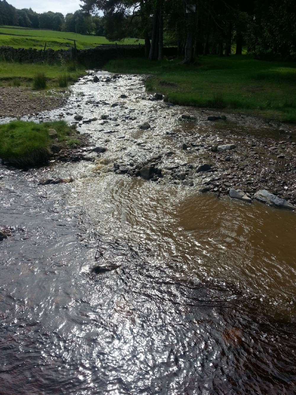 Flowing into the Howden Burn (foreground). A vast volume of water suddenly issuing from the level.