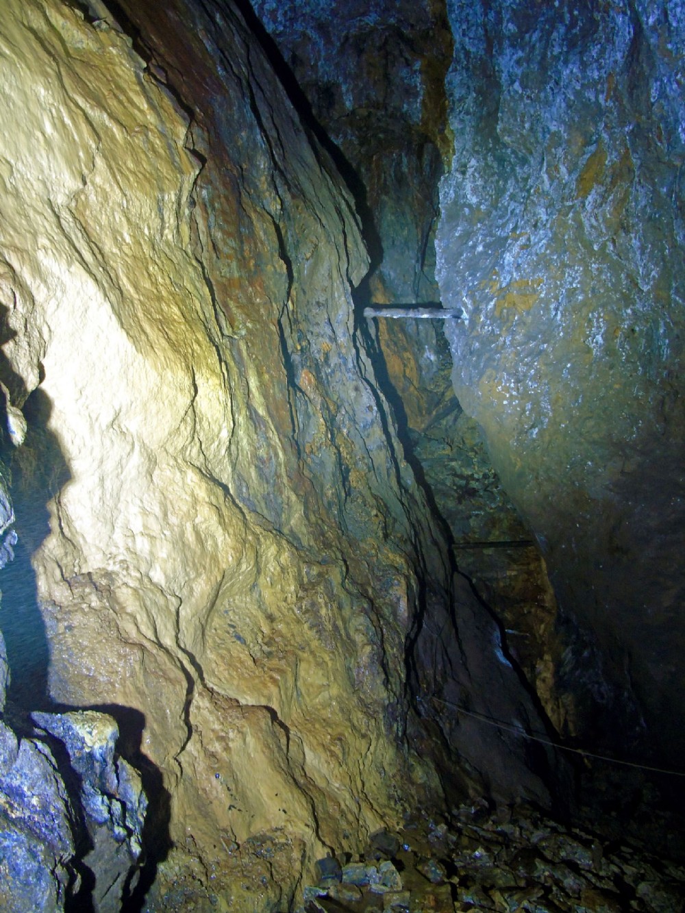 Believed to be coming from old workings slightly north of the main adit, the second waterfall from no 1 winze background right. Background centre is a collapse into the lower workings where the stream sinks, and slightly left the traverse along a ledge to reach the back of the stope.