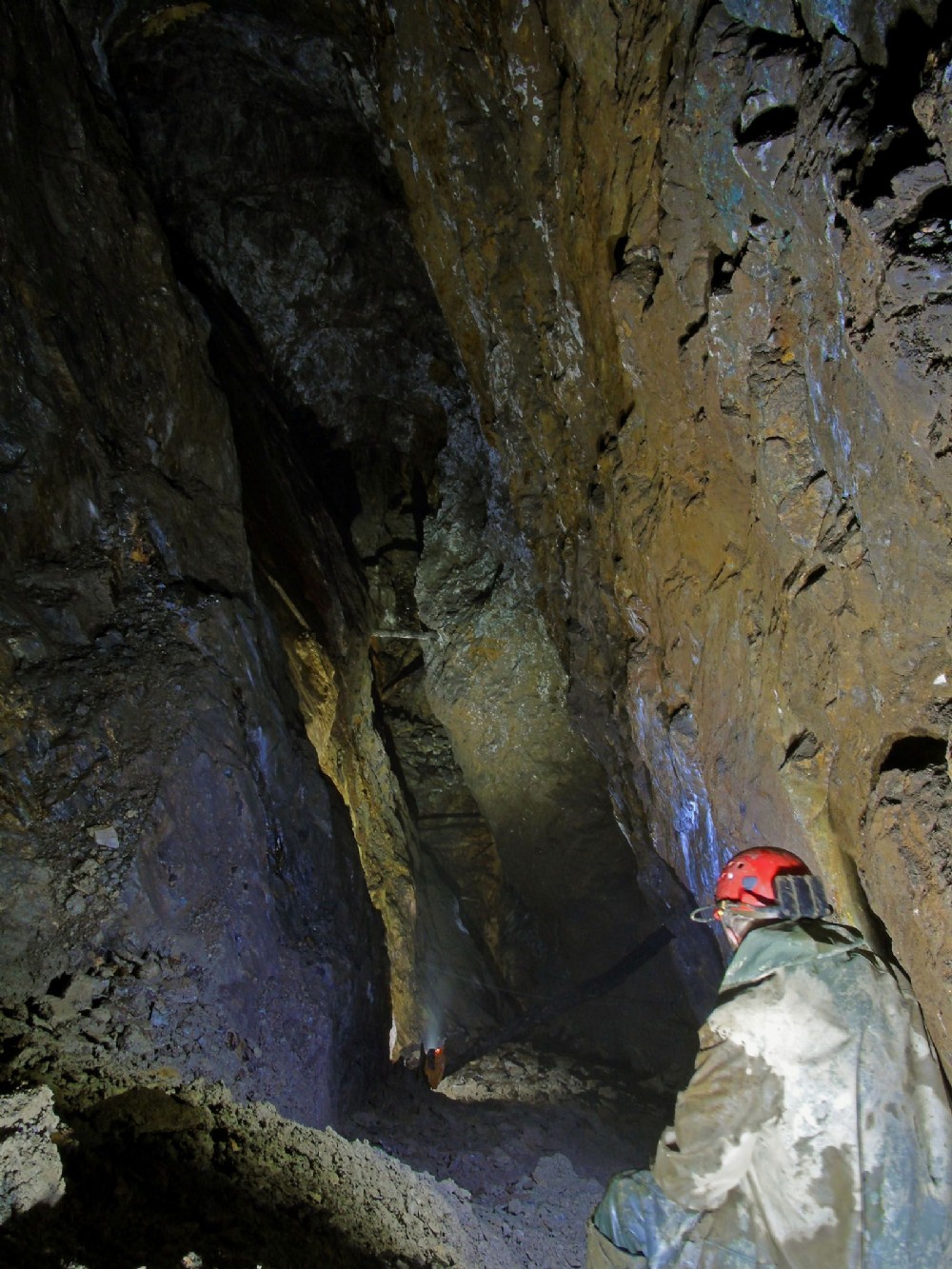 The outbye section of the main stope reached by the 2018 dig. It plunges steeply down a loose rubble slope, cowstails advised. The back is reached by an in situ traverse line.