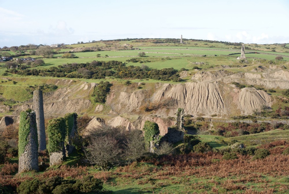 West Caradon dumps centre with remains at Eliott shaft to right. Nearview are ruins at S Caradon and in distance is Craddock Moor mine.