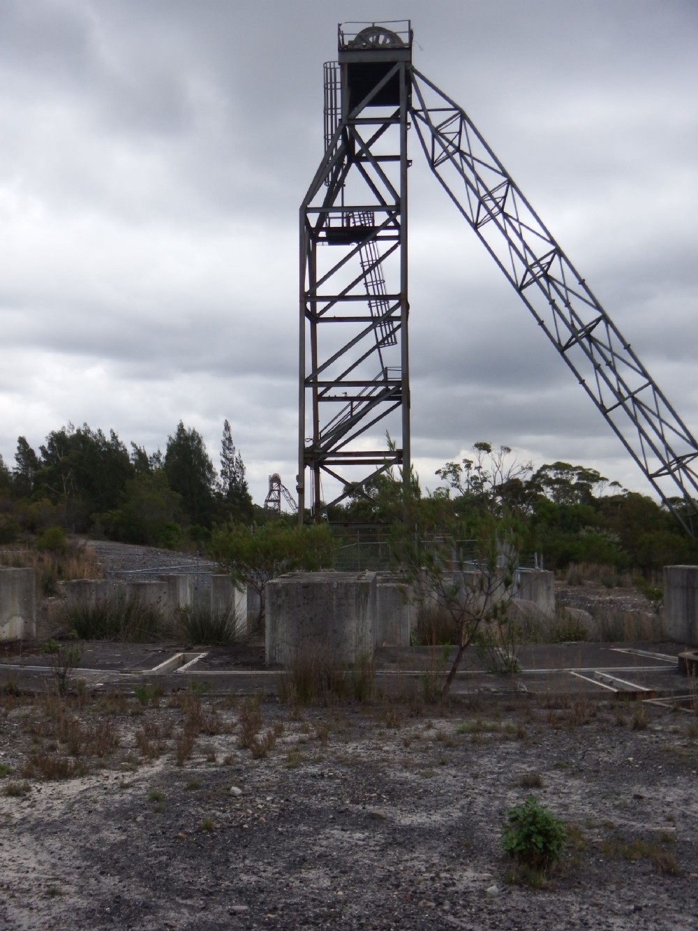 No.3 and No.4 ventilation shafts (the second one is seen on the horizon at the base of the nearest headstock). The nearest shaft has been blocked by a massive concrete plug.