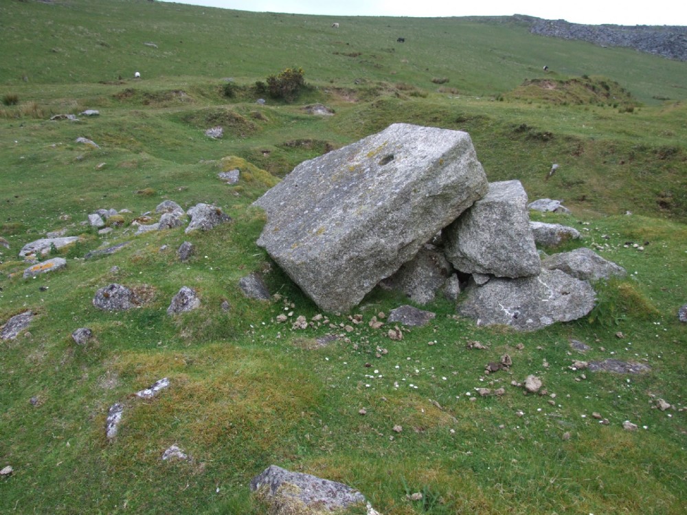 Parts of the broken bedstone on the summit of the pumping engine mound.Golddiggings Quarry finger dump on the skyline. 06-06-10