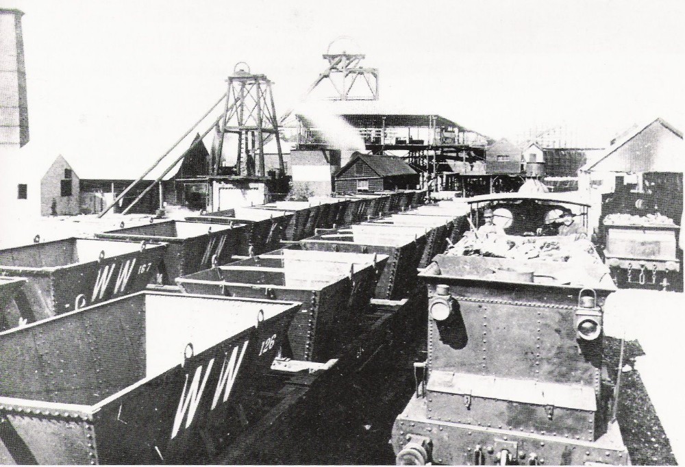 West Wallsend Colliery c1890s, showing main shaft (centre) and air shaft (left), with locomotives at the ready for coal haulage to port.