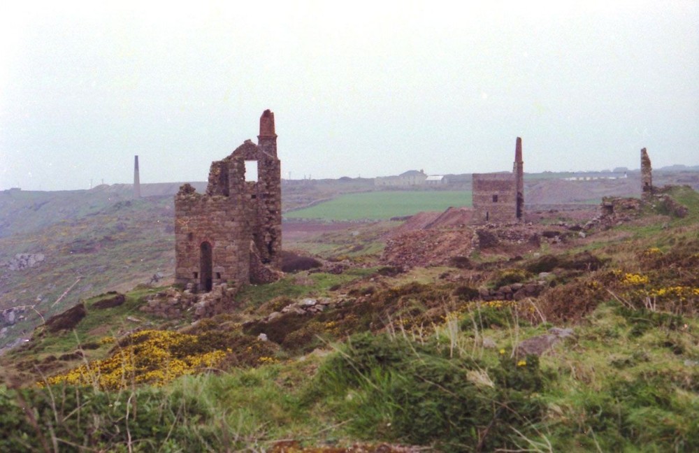 The engine house on a misty late winter's day, 1981. Wheal Owles is directly behind with the Botallack (?) count house in the distance. The compressor stack is on the left - this predates the new Allen's shaft headframe.