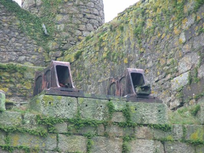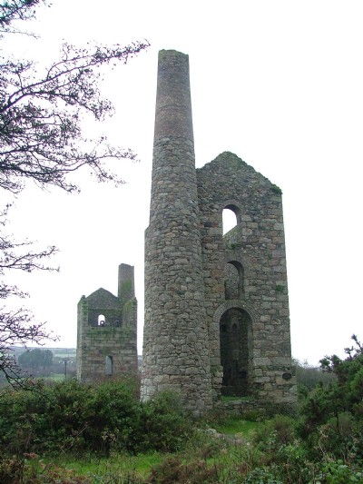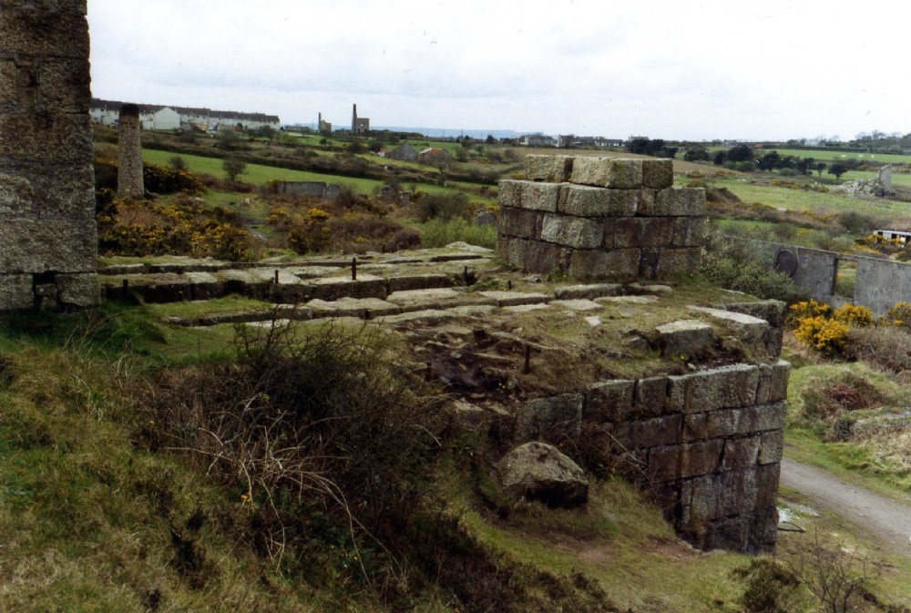 New Stamps at Wheal Grenville, erected ca. 1890. The granite plinth on the edge of the platform supported an auxiliary beam operated by the flywheels, which powered a short lift of pumps to raise water for use in the stamps.