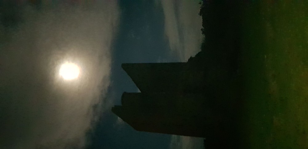 the 2020 supermoon glowing through the clouds appearing close to the stack of a stack associated with wheal harriet Pengegon Camborne Cornwall