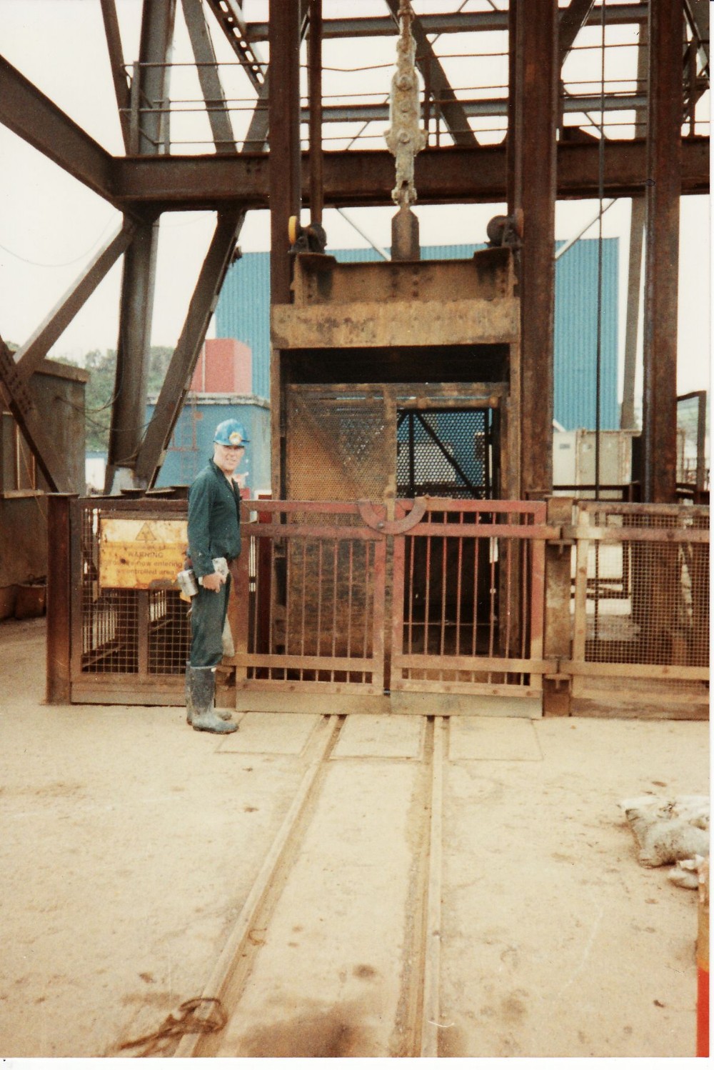 Alan Tomlin waiting to decend into the depths of Wheal Jane 19/5/1990.