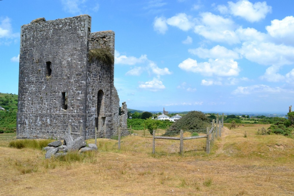 Bellingham's Shaft Engine House, built 1886, with the shaft itself fenced round post-surface collapse. In the distance (C) Prince of Wales Shaft Engine House of 1907 and (R) Wheal Jenkin Stamps Engine House. Photo taken Friday 13 July 2018.