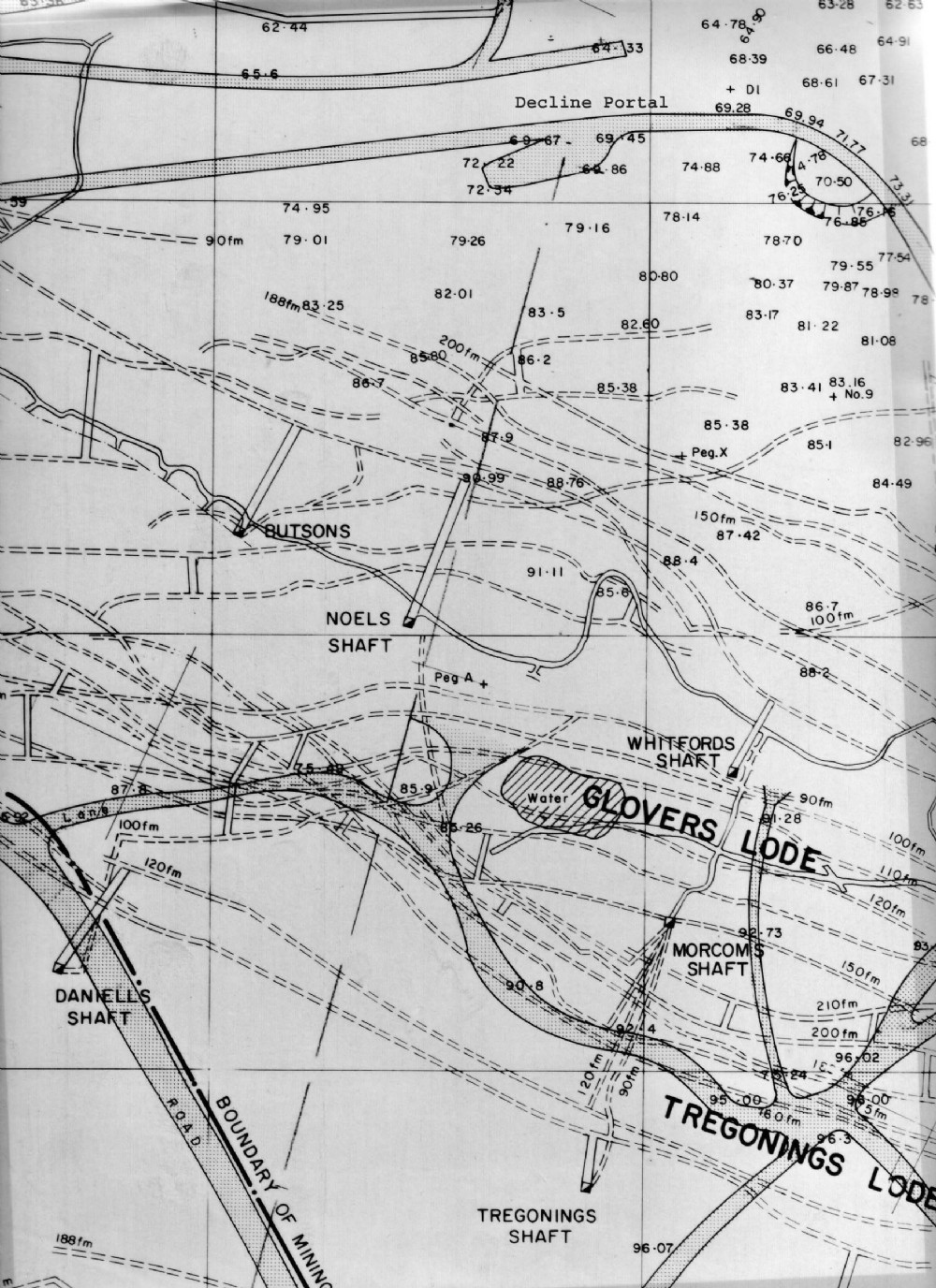 This is the proposed course of the Decline accross the old Consols workings to a point beneath Garlands Farm where it turned 180 degrees, heading back towards Whiteworks mine and then turned 90 degrees left to eventually, had the project continued, head out under United Mines and on toward Ting Tang Mine.