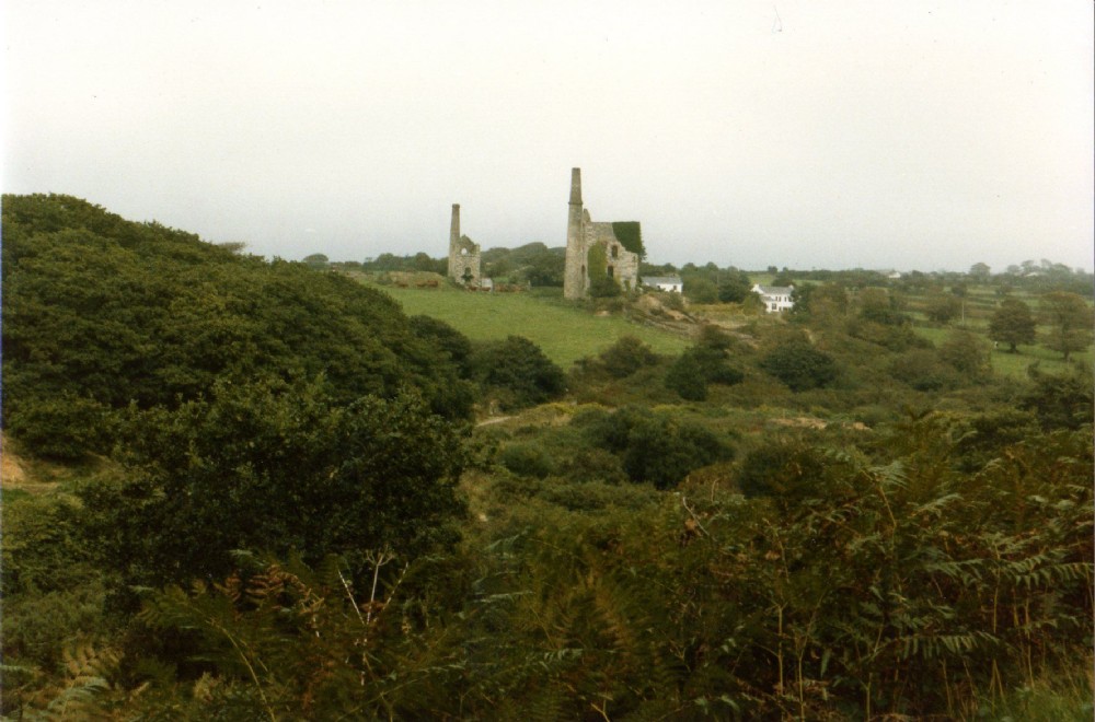 The Unity Wood engine houses viewed from the course of the Poldice Tramroad. 1985.