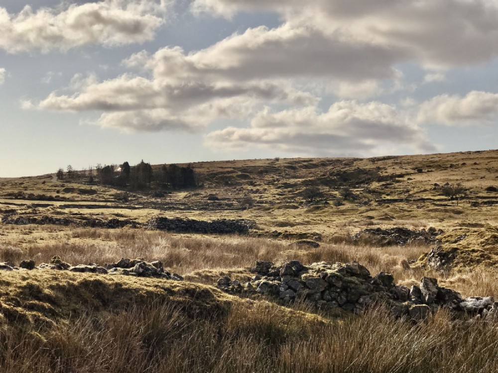 Looking NW from the adit portal to the ancient stream and open works elevated above the Foxtor Mires.