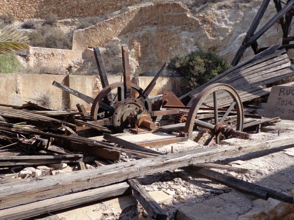 Side view of the remains of the winding machinery (reputed to have been a flat rope winder). The wood lying around is the remains of the wooden building housing the machinery.