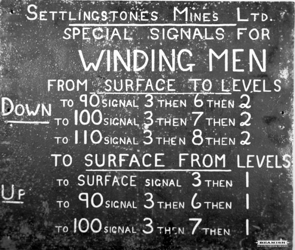 Hand painted steel sign giving special signals for winding men at Settlingstones Witherite Mine. Size 510 x 431mm.