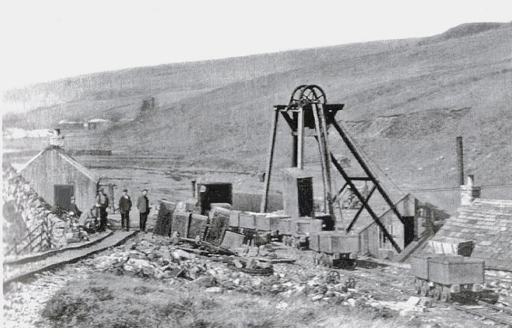 Photo taken early 1900s after the mine was reopened by Weardale Lead Co who linked it with the narrow gauge line they built from Rispey mill to Groverake just visible in the background. The men are standing beside the loco Little Sally which worked the line from 1889 to 1909.