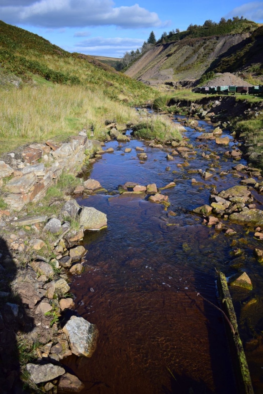Wooden structure visible in the front of the photo. There is a flat bottom (possibly) wooden on the bed of the beck and one side of the wooden channel is visible. There are a number of these in the water course. There is also part of a wall on the left bank. The things on the right bank are beehives.