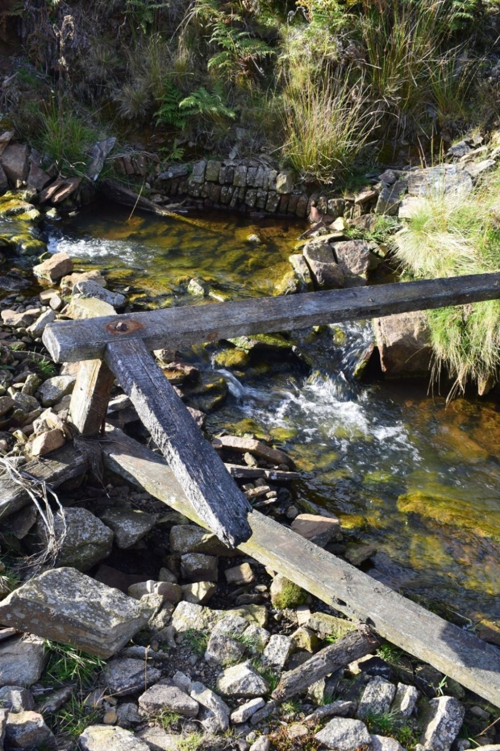 End on stone as a retaining wall, there are a few other examples of this style around the site. The is also some wooden structures built in to the beck. This may represent re-alignment of the beck and associates ore washing or buddling in the beck itself. Some of the wooden feature appear to be in sections on the bed of the beck and look like weir or ponds in the beck. I am not sure if the wooden structure is original to the site, but the wood look in reasonable condition, it could be an overturned jig or something similar
