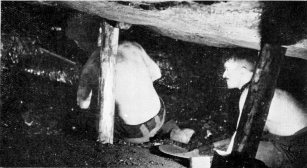 Accompanying caption: "When the men have descended the pit shaft those who are engaged in the actual hewing of coal make their way along "roads" to the coal face. The photograph shows men at work at the coal face; props holding up the roof can be seen in the foreground."