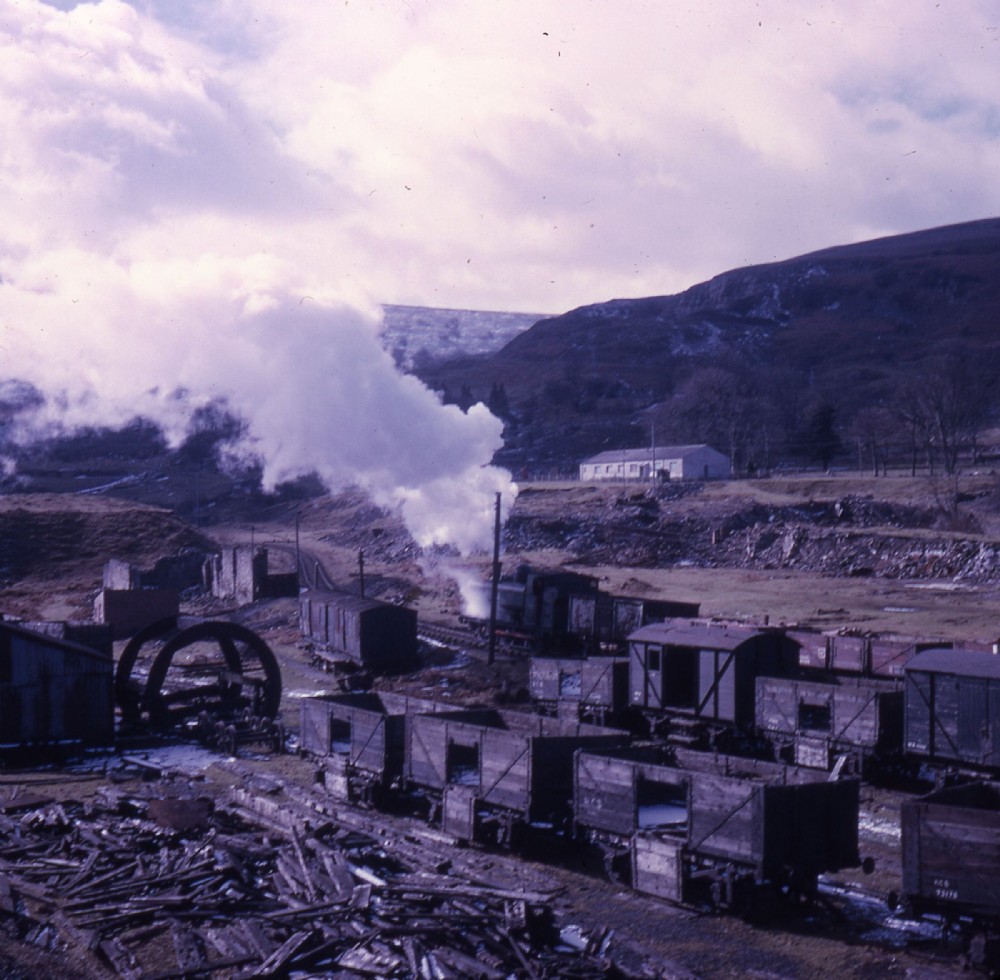 A fine collection of old wagons and mining machinery with pannier tank 7754 disappearing up the hillside in March 1970